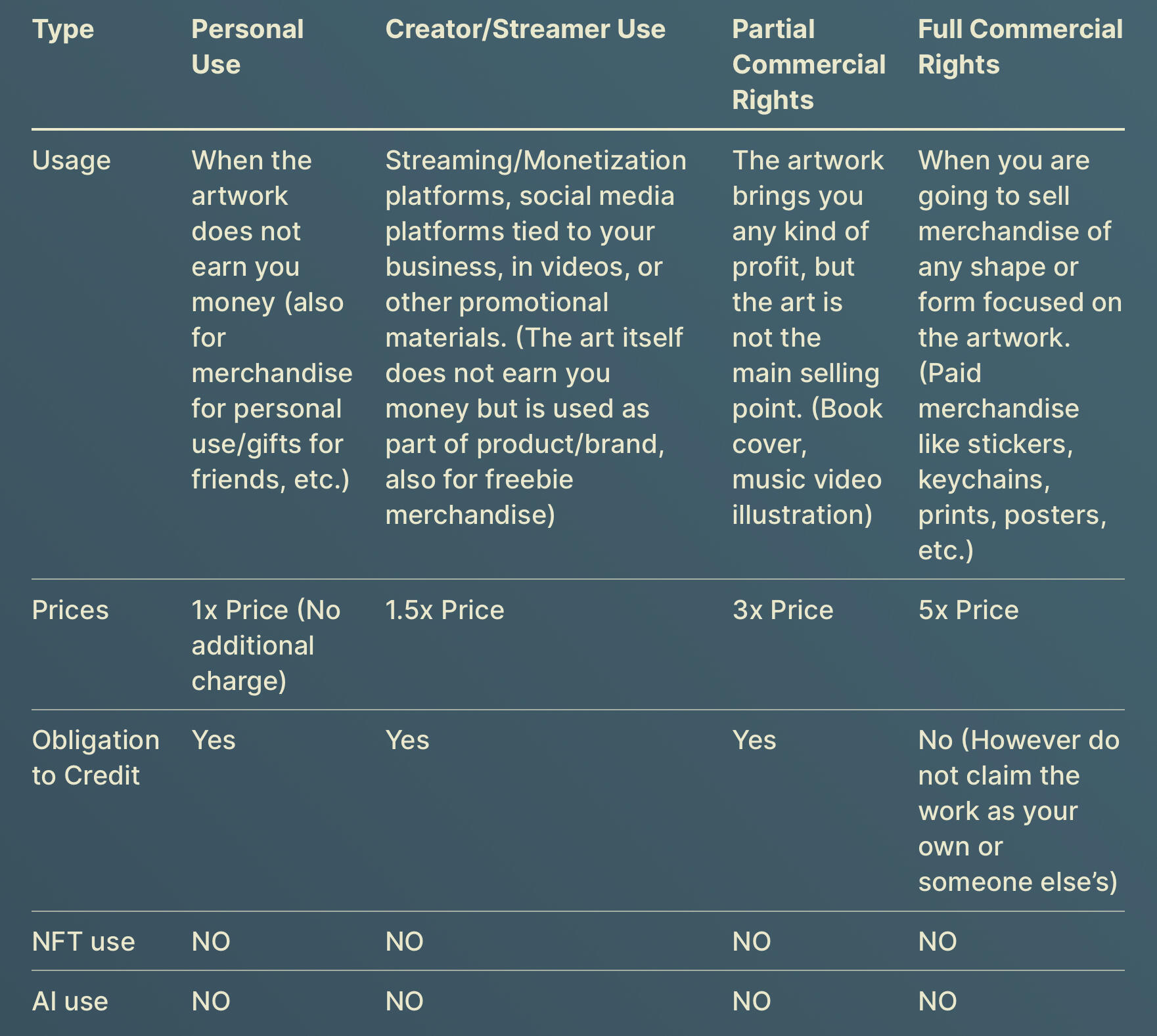 - Complex or heavily detailed backgrounds start at $10, but may increase depending on the exact type.- Design Commissions fees start at $5, but may increase to $15 based on complexity of design.- Each extra character is 50% of base price.- During the sketching and WIPs phase, any changes or adjustments are free of charge. If a large change is requested after I complete the commission (for example, changing an entire outfit/pose), a fee of up to $10 may be charged based on complexity of the change.- Refer to the chart below for usage rights and pricing.